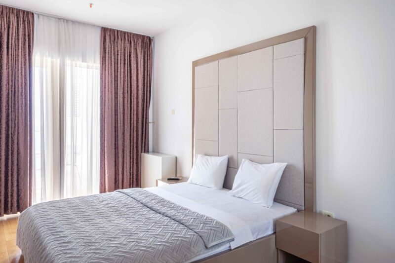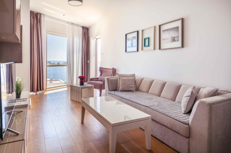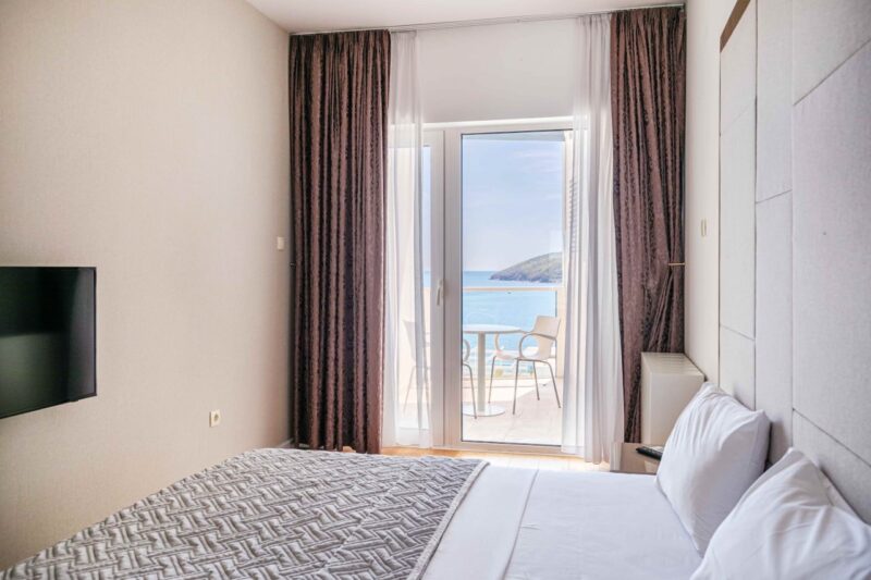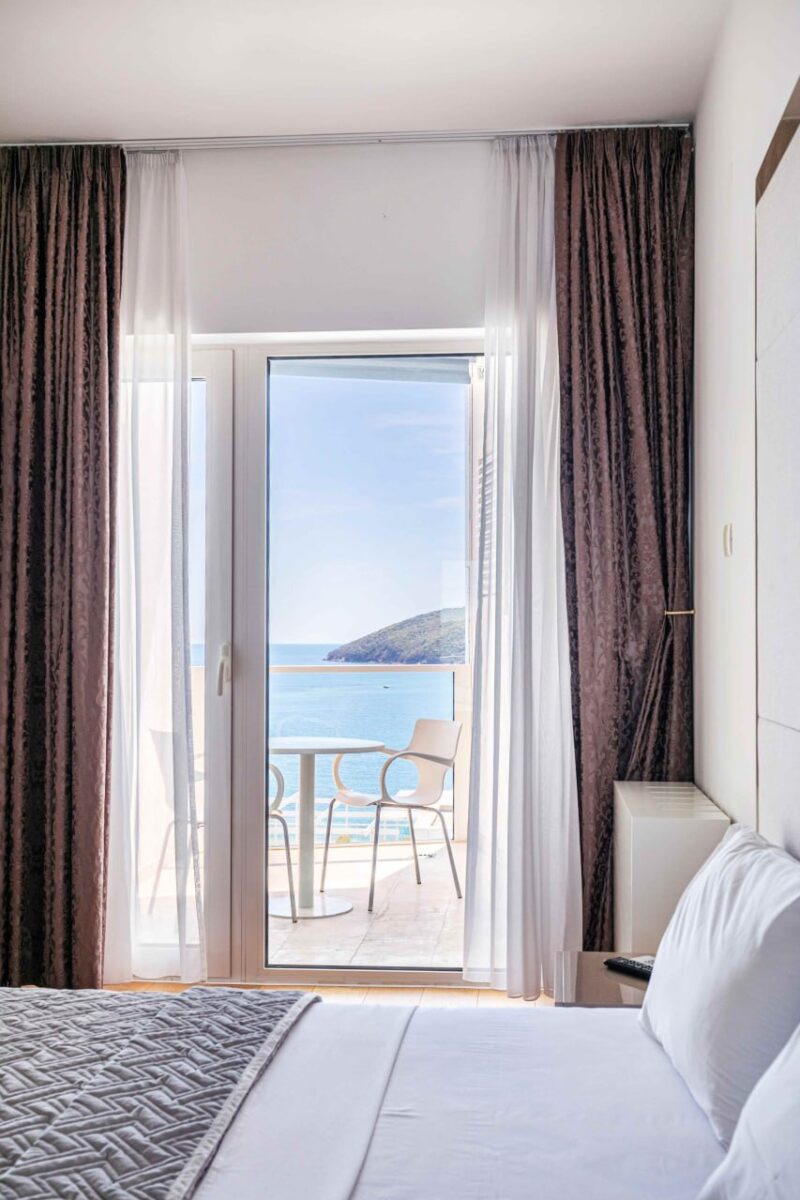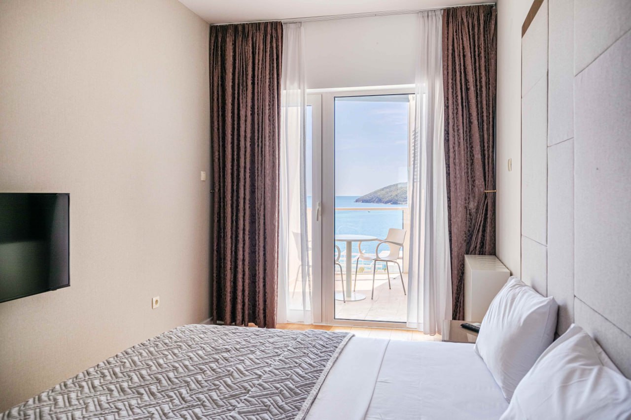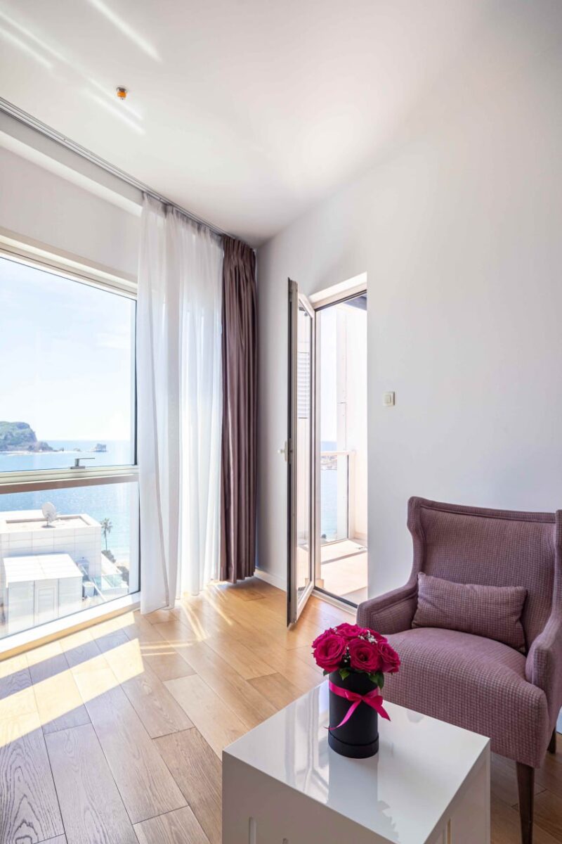 Однокомнатная квартира в самом центре Будвы с террасой и видом на море, на первой линии, 12 этаж, большая круглая башня, площадь 77 м².