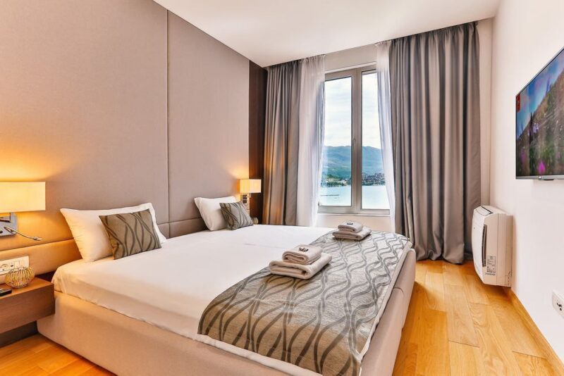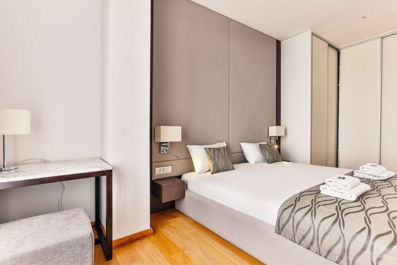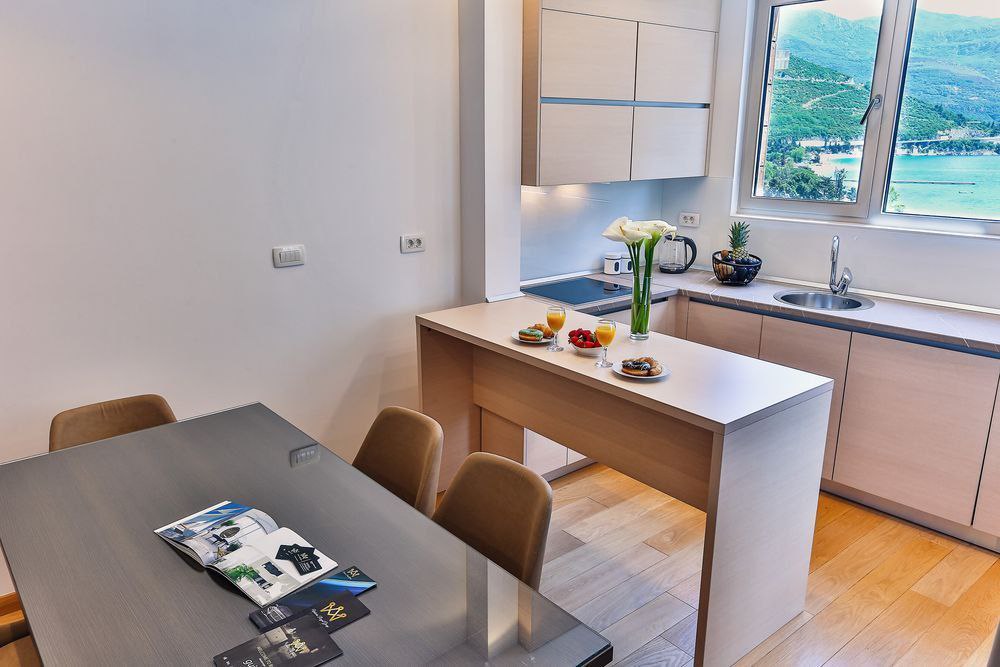 Сдаётся с 1 октября 2025 года по 25 мая 2026 года двухкомнатная квартира в самом центре Будвы, на первой линии моря. Площадь квартиры — 76 м², расположена в новом гостиничном комплексе, на восьмом этаже.