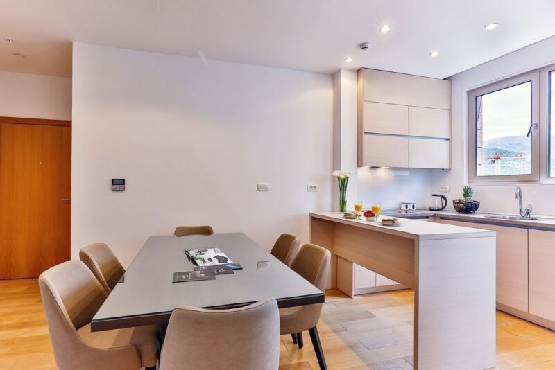 Квартира полностью оснащена всем необходимым для комфортного проживания и меблирована современной и стильной мебелью. Также имеется прекрасный боковой вид на море и Старый город.
